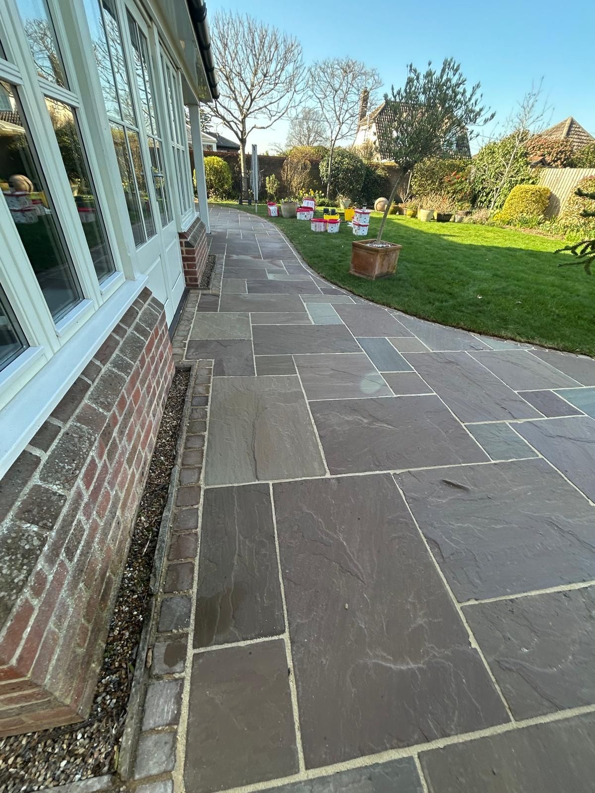 We also offer patio re-pointing services. This includes grinding out old or failed pointing, thoroughly cleaning the joints, and re-pointing after cleaning. We can use a range of pointing materials depending on the finish and durability required, including traditional sand and cement pointing, resin-based jointing products, and premium options such as EasyJoint and Titan Pro Joint.